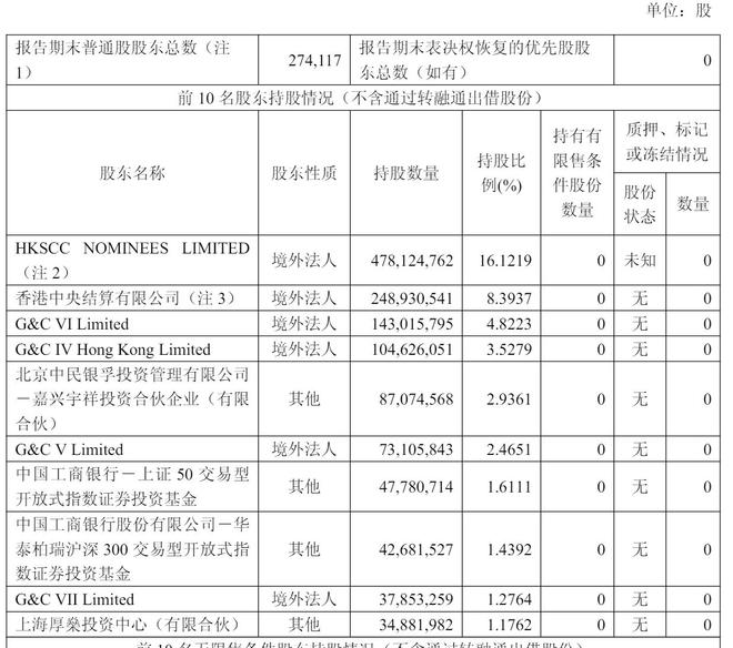 截至2025年9月30日,HKSCC NOMINEES LIMITED持股为16.1219%,香港中央结算有限公司持股为8.3937%,G&C VI持股为4.8223%,G&C IV Hong Kong Limited持股为3.5279%,北京中民银孚投资管理有限公司-嘉兴宇祥投资合伙企业(有限合伙)持股为2.9361%;