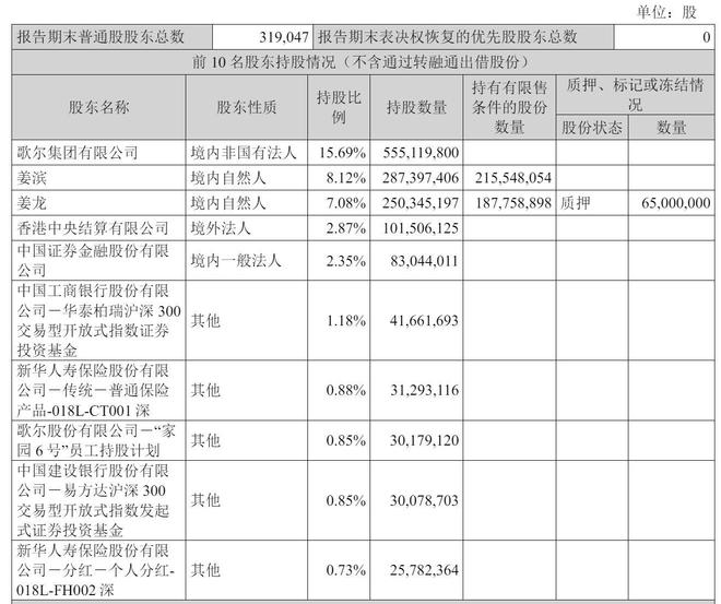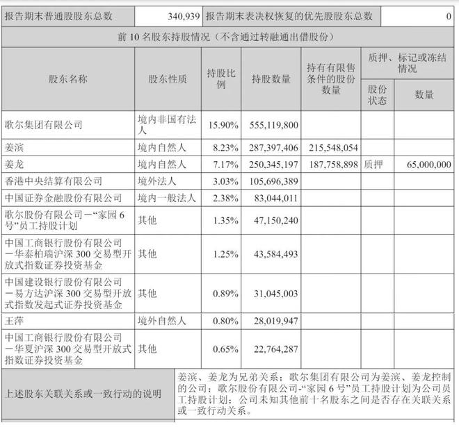 截至2025年6月30日,歌尔集团有限公司持股15.9%,姜滨持股8.23%,姜龙持股为7.17%,香港中央结算有限公司持股为3.03%,中国证券金融股份有限公司持股为2.38%;