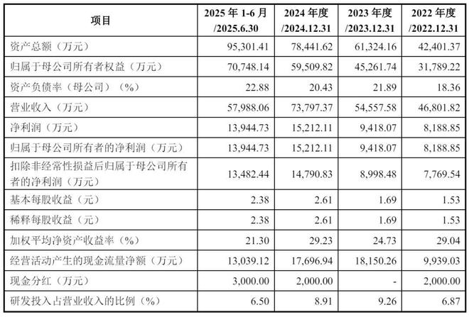好盈科技2025年上半年营收为5.8亿元,净利为1.39亿元,扣非后净利为1.35亿元。