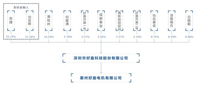 IPO前,张捷直接持有公司32.19%股份,作为好盈共赢一号执行事务合伙人间接控制公司5.31%表决权,作为好盈共赢二号执行事务合伙人间接控制公司 2.19%的表决权;刘友辉直接持有公司31.26%股份。