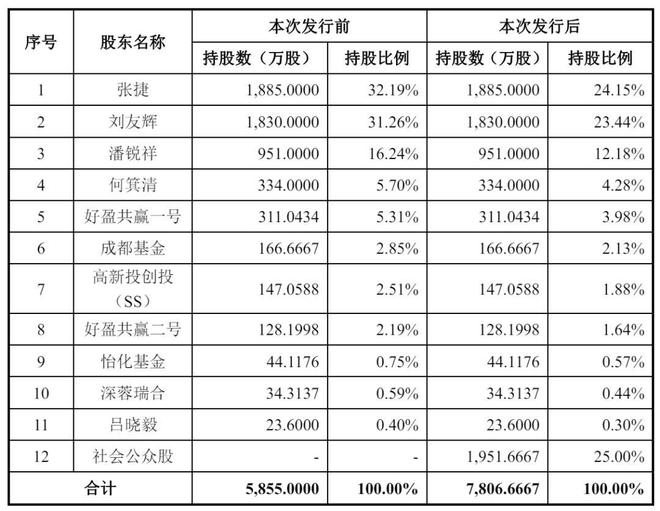 IPO后,张捷持股为24.15%,刘友辉持股为23.44%,潘锐祥持股为12.18%,何箕清持股为4.28%,好盈共赢一号持股为3.98%,成都基金持股为2.13%,高新投创投(SS)持股为1.88%;