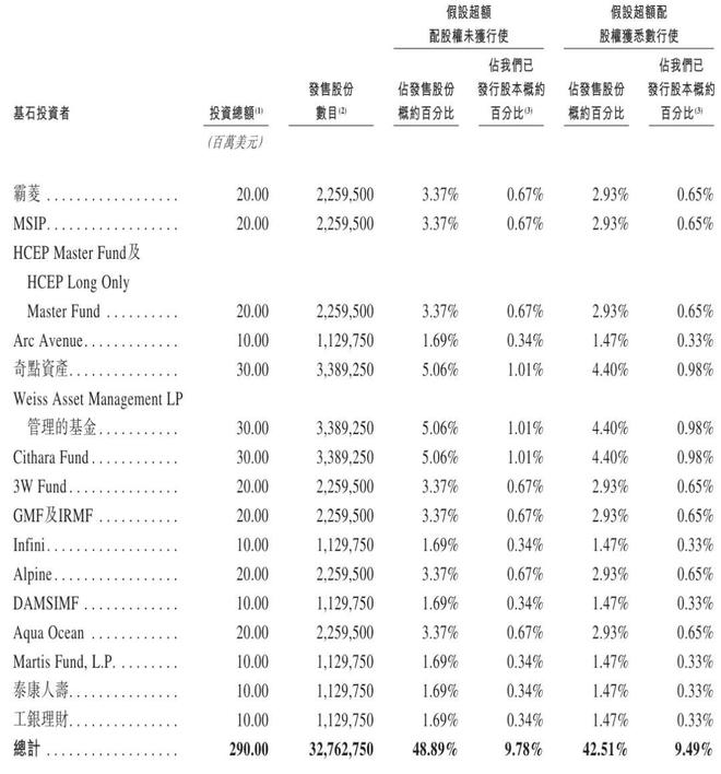 3W Fund、GMF及IRMF分别认购2000万美元,Infini认购1000万美元,Alpine认购2000万美元,DAMSIMF认购1000万美元,Aqua Ocean(博裕资本)认购2000万美元,Martis Fund(天壹资本)、泰康人寿、工银理财分别认购1000万美元。