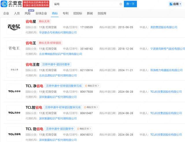 不过,记者注意到,据企查查APP显示,美的、格力、奥克斯等多家知名家电品牌均曾申请注册“特省电”“巨省电”“省电王”“劲省电”商标,目前商标多为无效或驳回待复审状态。