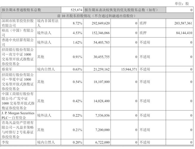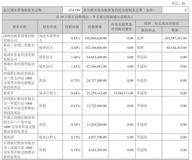 截至2025年3月31日,深圳市欧菲投资控股有限公司持股8.84%,裕高(中国)有限公司持股为4.6%,巢湖市生态科技发展有限公司持股为1.66%,香港中央结算有限公司持股为1.43%;