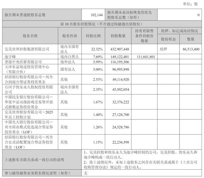 截至2025年6月30日,完美世界控股集团有限公司持股22.32%,池宇峰持股为7.69%,香港中央结算有限公司持股为5.99%,天津东富锐进投资管理中心(有限合伙)持股为5%;