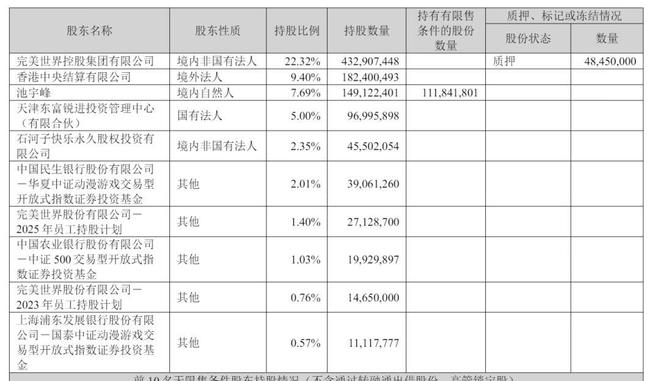 截至2025年9月30日,完美世界控股集团有限公司持股22.32%,香港中央结算有限公司持股为9.4%,池宇峰持股为7.69%,天津东富锐进投资管理中心(有限合伙)持股为5%;