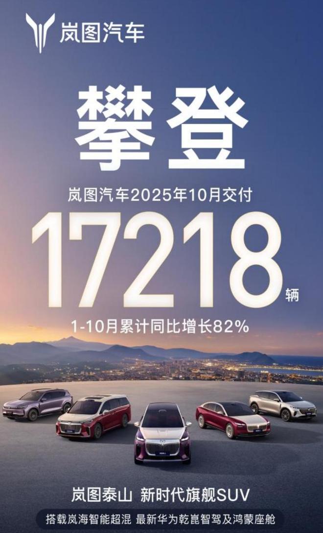 岚图汽车日前公布10月交付数据。10月,岚图汽车交付17218辆,再创历史新高;1-10月累计同比增长82%,实现“九连涨”。