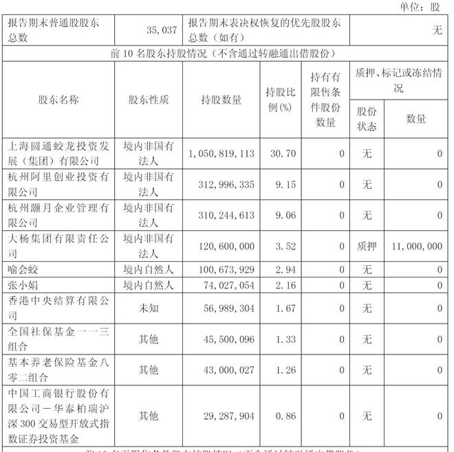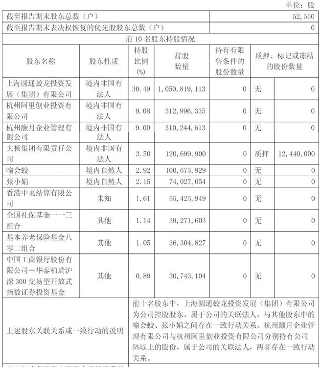 截至2025年6月30日,上海圆通蛟龙投资发展(集团)有限公司持股为30.49%,阿里旗下杭州灏月企业管理有限公司持股为9.08%,杭州阿里创业投资有限公司持股为9%,大杨集团有限责任公司持股为3.5%;
