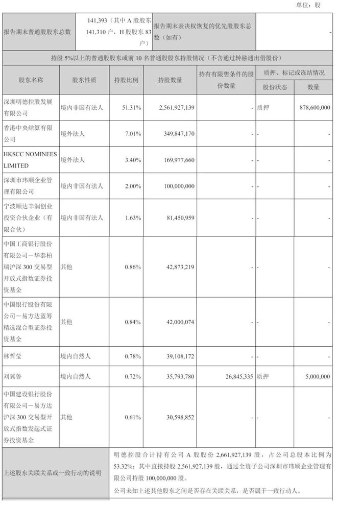 截至2025年6月30日,深圳明德控股发展有限公司持股为51.31%,香港中央结算有限公司持股为7.01%,HKSCC NOMINEES LIMITED持股为3.4%,深圳市玮顺企业管理有限公司持股为2%,宁波顺达丰润创业投资合伙企业(有限合伙)持股为1.63%;