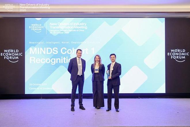 2025年10月29日至10月30日,世界经济论坛(又称“达沃斯论坛”)《产业转型升级新动力论坛》在杭州隆重举行。作为会议亮点之一,活动现场举行了首批世界经济论坛AI智慧之星MINDS(Meaningful, Intelligent, Novel, Deployable Solutions –有意义,智能,创新,可部署的解决方案)获奖企业颁奖典礼。来自包括工商银行、蚂蚁集团、西门子、富士通、黑湖科技、大地量子、易来科得,安脉盛、DeepX等机构的高管代表亲临现场领奖,展现出亚洲“AI+”创新力量的集体亮相。杭州安脉盛智能技术有限公司(以下简称“安脉盛”)凭借其在AI人工智能领域的创新实践与可量化价值,荣膺首批18家获奖企业之一,跻身全球产业智能化变革先行者行列。安脉盛联席总裁楼阳冰博士代表公司登台领奖并发表获奖感言。