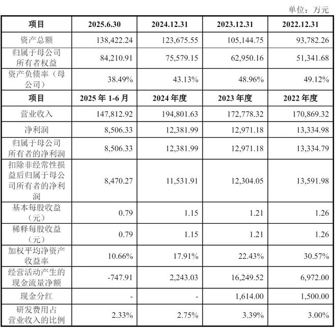 招股书显示,丰倍生物2022年、2023年、2024年营收分别为17.1亿元、17.3亿元、19.48亿元;净利分别为1.33亿元、1.3亿元、1.24亿元;扣非后净利分别1.36亿元、1.23亿元、1.15亿元。