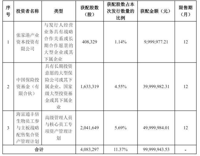 丰倍生物的基石投资者分别为张家港产业资本投资有限公司、中国保险投资基金(有限合伙)、海富通丰倍生物员工参与主板战略配售集合资产管理计划,一共认购1亿元,限售期限为12个月。