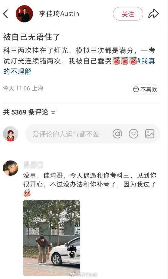 11月6日,网红博主李佳琦发文:“科三两次挂在了灯光,模拟三次都是满分,一考试灯光连续错两次,我被自己蠢哭。”