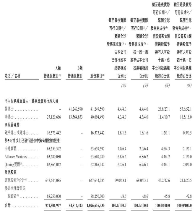 IPO前,韩旭博士通过XHL及THL持有41,249,590股B类普通股的权益,约占公司已发行股本总额的4.40%,及公司投票权的53.64%;李岩博士通过Humber Partners持有27,129,666股A类普通股和13,564,833股B类普通股的权益,约占公司已发行股本总额的4.3%,及公司投票权的18.5%(基于每股A类普通股赋予持有人可投一票及每股B类普通股赋予持有人可投40票计算);上述创始人和联合创始人合计持有公司投票权的72.1%,形成了稳固的管理层控制权。