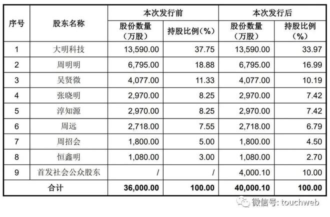 IPO后,大明科技持股为33.97%,周明明持股为16.99%,吴贤微持股为10.19%,张晓明、淳知源分别持股为7.42%,周远持股为6.79%,周招会持股为4.5%,恒鑫明持股为2.7%。