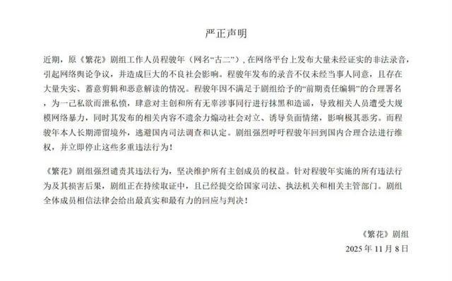 11月8日,电视剧《繁花》通过官方微博发布严正声明,控诉原《繁花》剧组工作人员程骏年(网名“古二”)“在网络平台上发布大量未经证实的非法录音,引起网络舆论争议,并造成巨大的不良社会影响”。