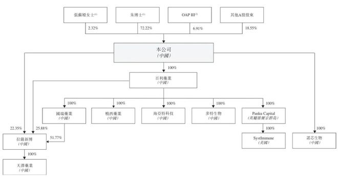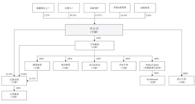 IPO后,朱义持有百利天恒70.74%股权,OAP III (HK) 持股为6.77%,张苏娅持股2.27%,其他A股股东持股18.18%,H股股东持股2.05%。