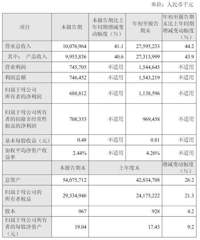 报告期末,公司总资产为540.76亿元,较年初增加26.2%;归属于母公司的所有者权益为293.35亿元,较年初增加21.3%。