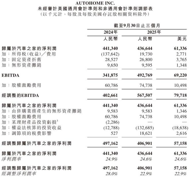 2025年第三季度归属于汽车之家的经调整净利润(非美国通用会计准则)为4.07亿元(5720万美元),2024年同期为4.97亿元。