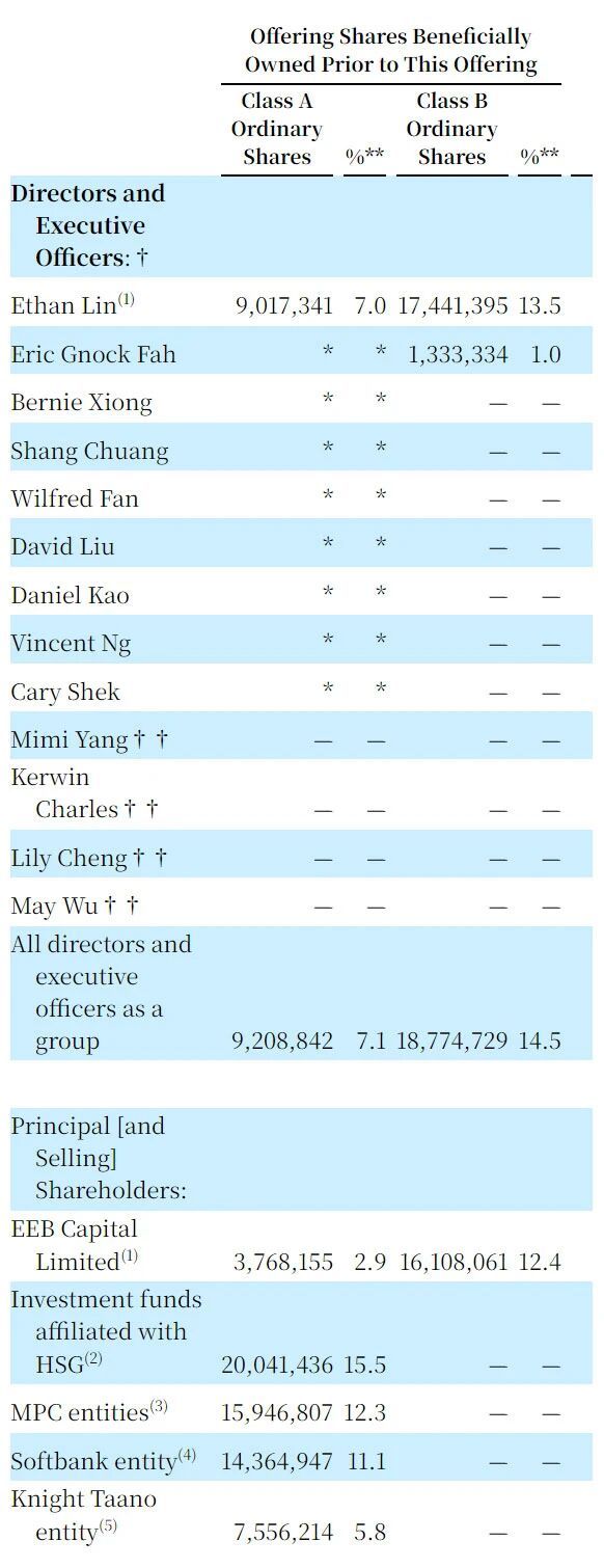 IPO前,Ethan Lin持有7%的A类股,13.5%的B类股;Eric Gnock Fah持有1%的B类股;EEB Capital持有2.9%的A类股,持有12.4%的B类股;