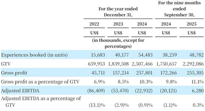 截至2025年前9个月,Klook的GTV为22.92亿美元,毛利占GTV的比例为11.1%,Adjusted EBITDA为628万美元,Adjusted EBITDA占GTV的比例为0.3%。