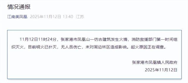 11月12日11时24分,张家港市凤凰山一仿古建筑发生火情,消防救援部门第一时间组织灭火,目前明火已扑灭,无人员伤亡,未对周边林区造成影响。起火原因正在调查。
