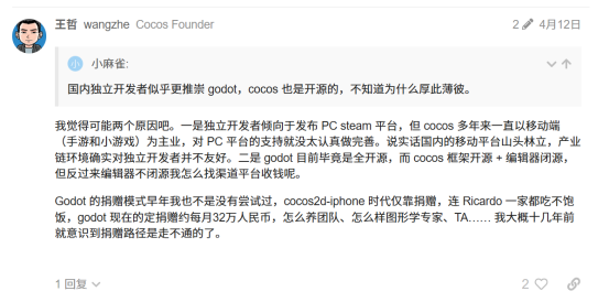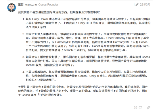 2022年3月的时候cocos论坛有个这样的帖子,聊中美竞争的背景下,未来技术封锁Cocos可能成为唯一可以用的国产引擎。