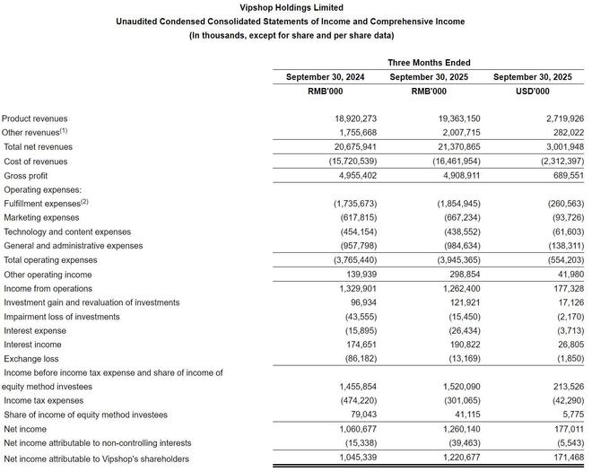 唯品会2025年第三季度净利为12.6亿元(约1.77亿美元),较上年同期的10.61亿元增长18.76%。