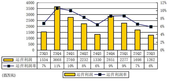 唯品会2025年第三季度运营利润为12.62亿元,较上年同期的13.3亿元下降5.1%;唯品会2025年第三季度运营利润率为5.9%,较上年同期的6.4%下降0.5个百分点。