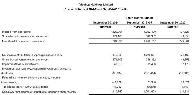 唯品会2025年第三季度Non-GAAP下归属于公司股东的净利为15亿元(约2.11亿美元),上年同期为13.11亿元。