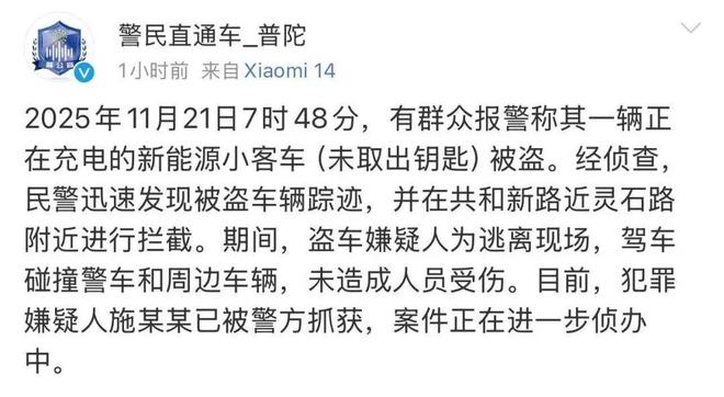 11月21日中午,上海普陀警方发布警情通报:2025年11月21日7时48分,有群众报警称其一辆正在充电的新能源小客车(未取出钥匙)被盗。经侦查,民警迅速发现被盗车辆踪迹,并在共和新路近灵石路附近进行拦截。