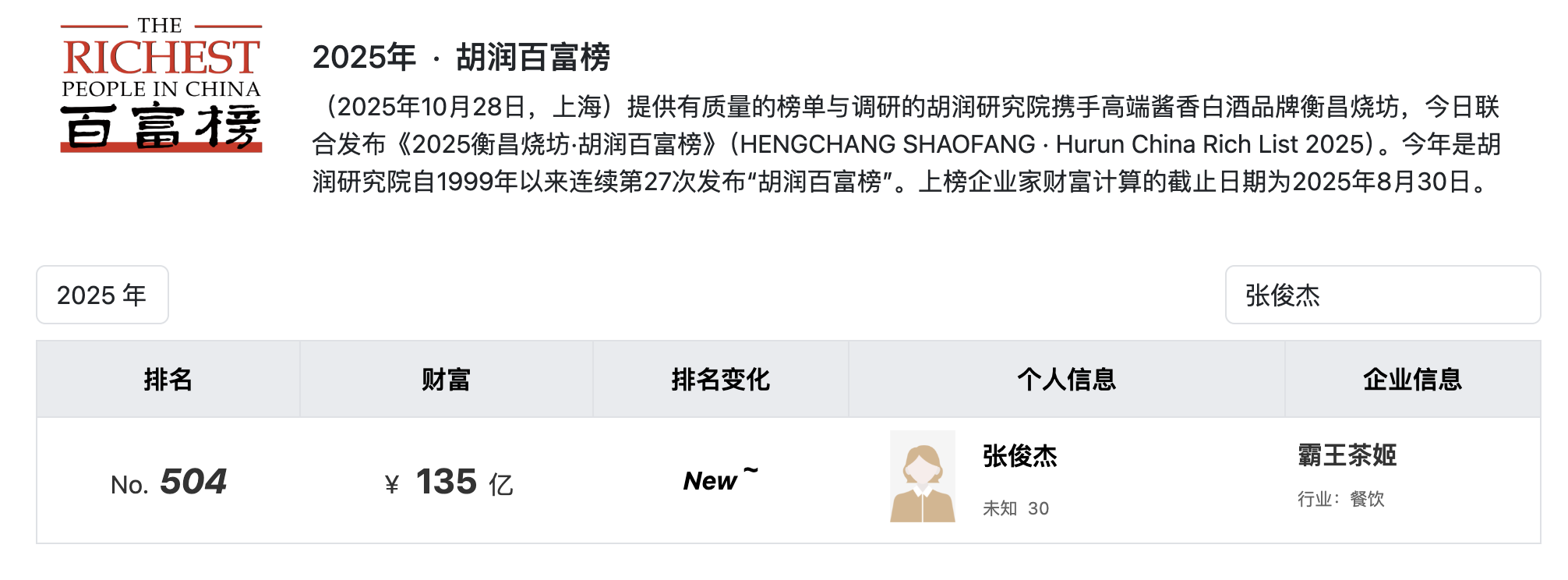 2025年,张俊杰也凭借霸王茶姬上榜《胡润百富榜》,以135亿元的财富值位列第504名,与高纪凡家族的差距只有23名。而从一名孤儿到如今的“富豪”,张俊杰只用了15年。