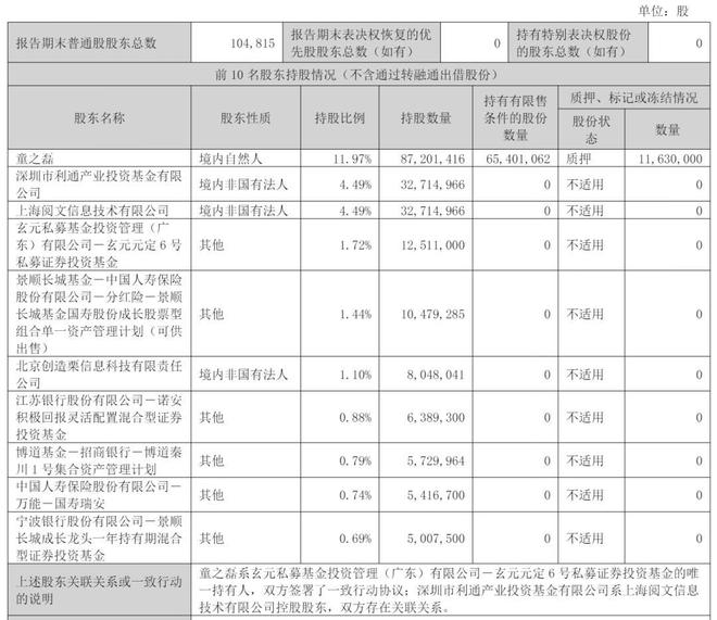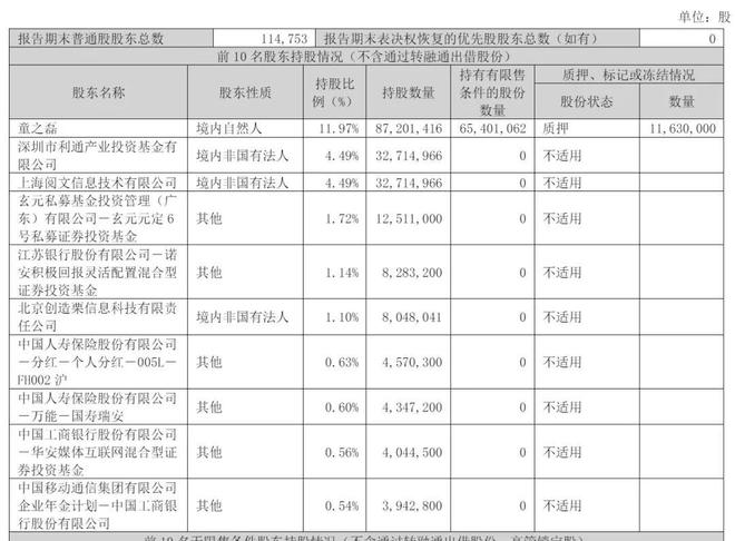 截至2025年3月31日,童之磊持股11.97%,深圳市利通产业投资基金有限公司持股4.49%,上海阅文信息技术有限公司持股4.49%,玄元私募基金投资管理(广东)有限公司-玄元元定6号私募证券投资基金持股为1.72%,江苏银行股份有限公司-诺安积极回报灵活配置混合型证券投资基金持股为1.14%,北京创造栗信息科技有限责任公司持股为1.1%,中国人寿保险股份有限公司-分红-个人分红-005L-FH002 沪持股为0.63%,中国人寿保险股份有限公司-万能-国寿瑞安持股为0.6%;