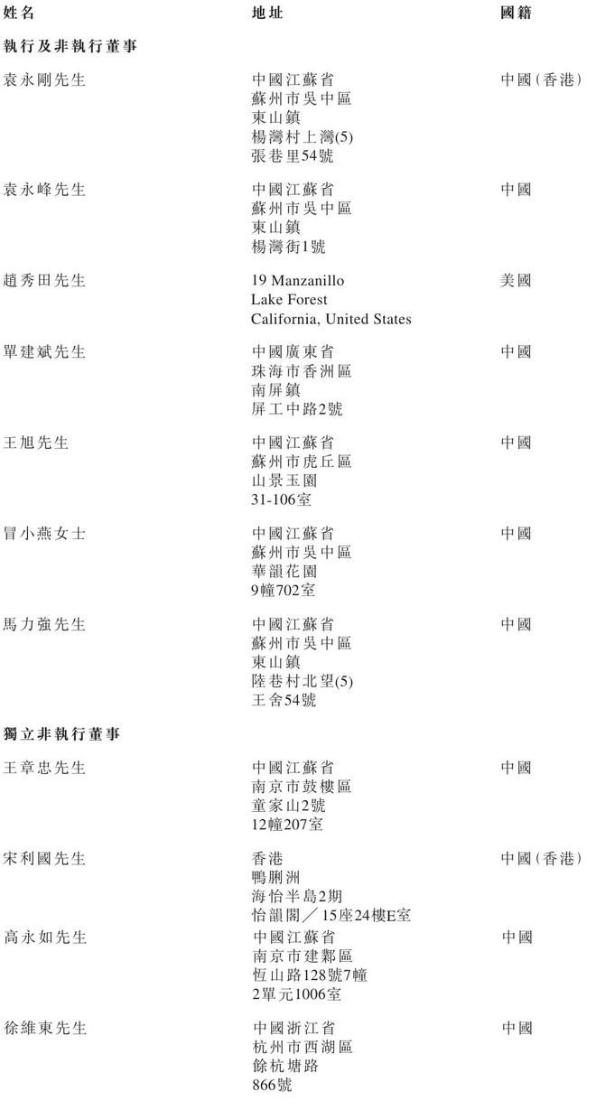 东山精密执行及非执行董事分别为袁永刚、袁永峰、赵秀田、单建斌、王旭、冒小燕女士、马力强;独立非执行董事分别为王章忠、宋利国、高永如、徐维东。