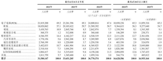 东山精密2025年上半年来自电子电路(PCB)收入为110.59亿元,占营收的比例为65.2%;来自精密组件收入为23.62亿元,占比为13.9%;来自触控面板及液晶显示模组收入为30.49亿元,占比为18%。