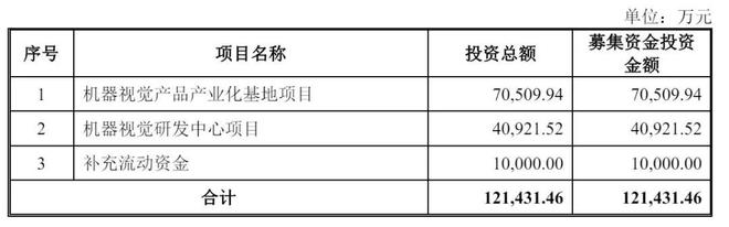易思维计划募资12.1亿元,其中,7.05亿元用于机器视觉产品产业化基地项目,4.09亿元用于机器视觉研发中心项目,1亿元用于补充流动资金。