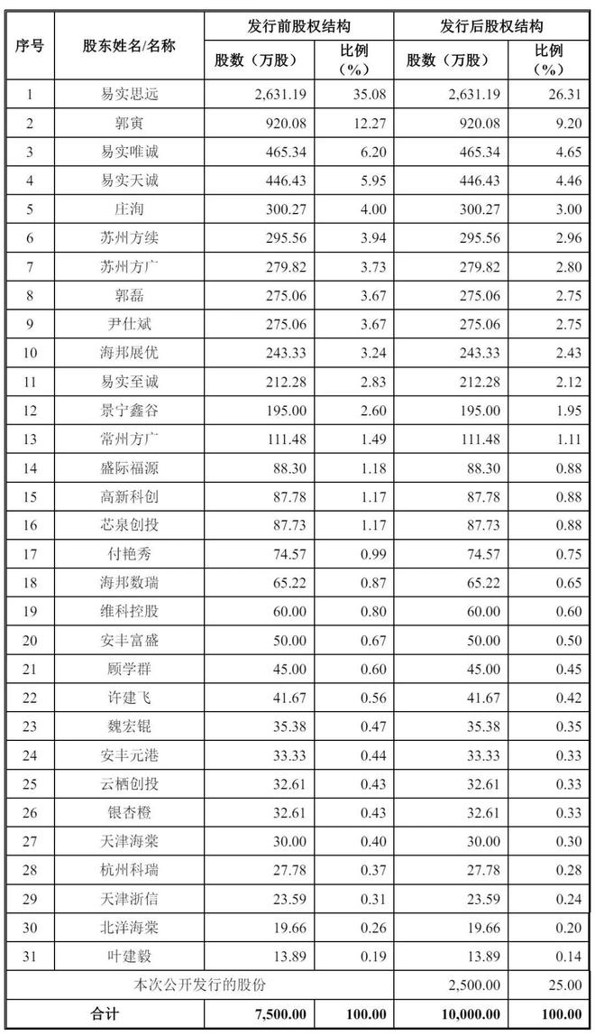 IPO后,易实思远持股为26.31%,郭寅直接持股为9.2%,易实唯诚持股为4.65%,易实天诚持股为4.46%,庄洵持股为3%,苏州方续持股为2.96%,苏州方广持股为2.8%,郭磊、尹仕斌分别持股为2.75%,海邦展优持股为2.43%,易实至诚持股为2.12%;