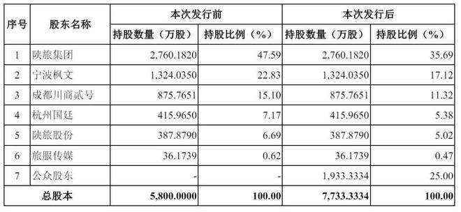 IPO后,陕旅集团持股为35.69%,宁波枫文持股为17.12%,成都川商贰号持股为11.32%,杭州国廷持股为5.38%,陕旅股份持股为5.02%,旅服传媒持股为0.47%。