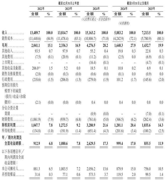 招股书显示,创新国际2022年、2023年、2024年营收分别为134.9亿元、138亿元、151.63亿元;毛利分别为20.41亿元、23.36亿元、42.77亿元;毛利率分别为15.1%、16.9%、28.2%;期内利润分别为9.13亿元、10.8亿、26.3亿元;期内利润率分别为6.8%、7.8%、17.3%。