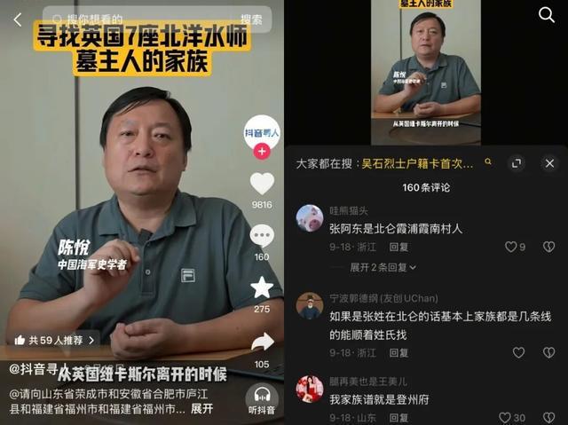此时“抖音寻人”的出现,架设了一条不同于以往的全新寻找方法。2025年的9月,本着试试看的念头,我通过“抖音寻人”录制寻找视频,在9月17日甲午黄海海战纪念日开始向网络发声,以研究者的身份开始呼唤,开始了北洋海军历史研究新的尝试。首批视频在抖音播放量近600万,也很快收获了来自网友们的线索,这样的效率与过去的街头奔走不可同日而语。相信在持续的寻找下,科技将为北洋海军后人图谱再添一块新的拼图。