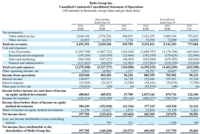陌陌母公司挚文集团(Nasdaq:MOMO)昨日公布2025年第二季度及上半年财报。财报显示,挚文集团2025年上半年营收为51.41亿元(约7.18亿美元),较上年同期的营收52.52亿元下降2.1%。