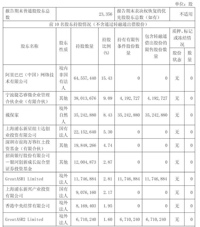 截至2025年9月30日,阿里持股为15.43%,宁波捷芯睿微企业管理合伙企业(有限合伙)持股为9.09%,戴保家持股为8.43%,上海浦东新星纽士达创业投资有限公司持股为5.3%,深圳市前海万容红土投资基金(有限合伙)持股为4.74%;