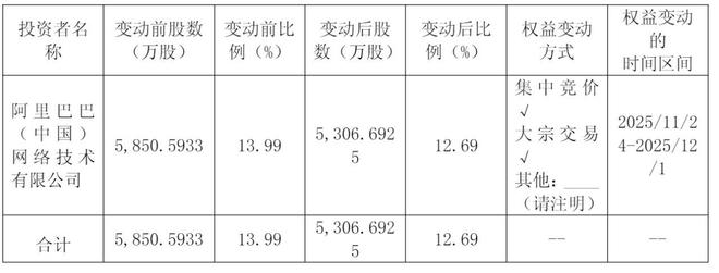 2025年11月24日至2025年12月1日,阿里巴巴通过集中竞价及大宗交易方式减持公司股份5,439,008股,占公司总股本的比例由13.99%减少至12.69%。阿里持股比例下降1.3个百分点。