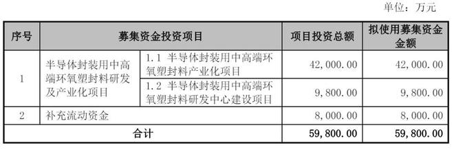 中科科化计划募资6亿元,其中,4.2亿元用于半导体封装用中高端环氧塑封料产业化项目,9800万元用于半导体封装用中高端环氧塑封料研发中心建设项目,8000万元用于补充流动资金。