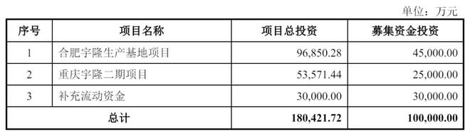 宇隆科技计划募资10亿元,其中,4.5亿元用于合肥宇隆生产基地项目,2.5亿元用于重庆宇隆二期项目,3亿元用于补充流动资金。