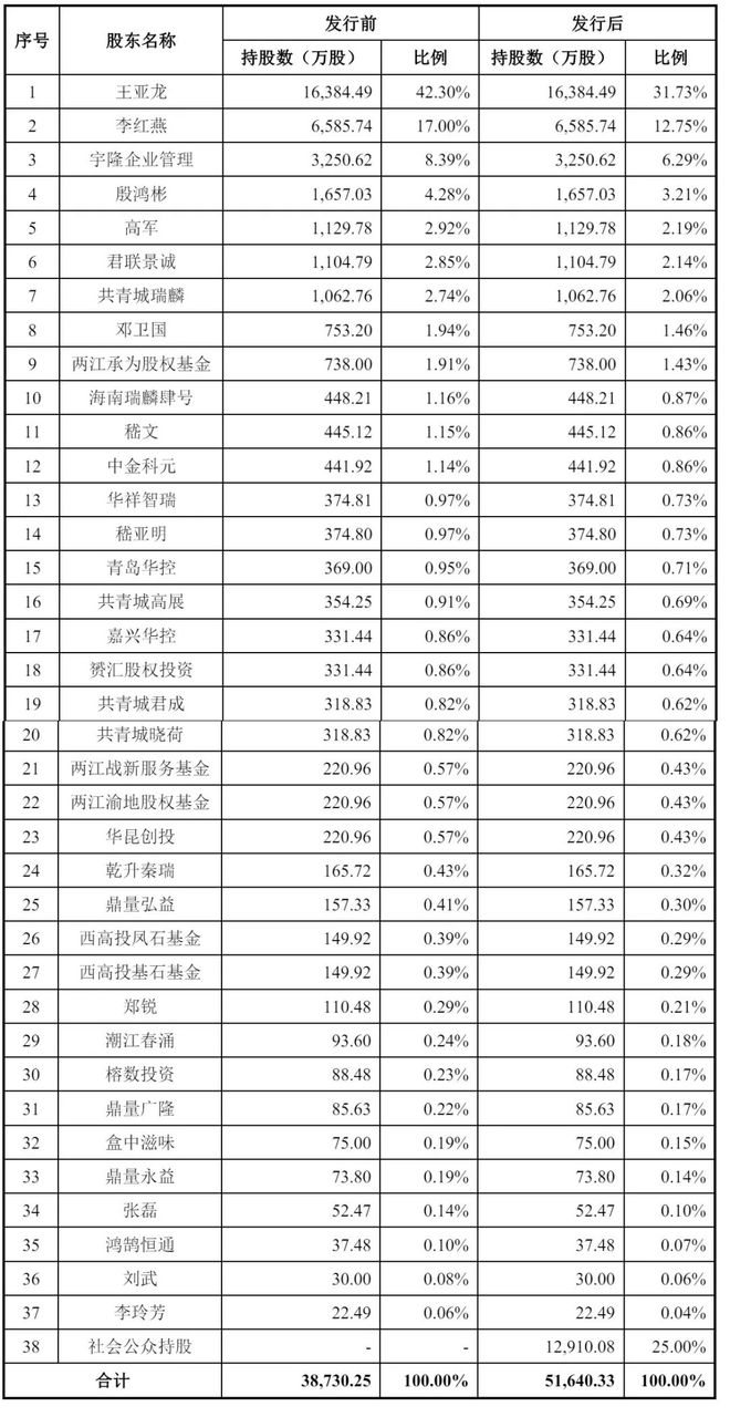 IPO后,王亚龙持股为31.73%,李红燕持股为12.75%,宇隆企业管理持股为6.29%,殷鸿彬持股为3.21%,高军持股为2.19%,君联景诚持股2.14%,共青城瑞麟持股为2.06%,邓卫国持股为1.46%,两江承为股权基金持股为1.43%,海南瑞麟肆号持股为0.87%;