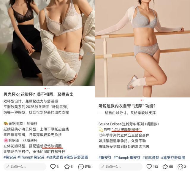 例如,其“逆龄芳华”系列强调“点状按摩钢圈槽”,2025年秋冬新品“平衡致美”仍主打“记忆软钢圈”,持续将宣传重点放在“聚拢”“塑形”等传统功能诉求上,与当前以“舒适”“无感”为主导的市场新风向形成鲜明对比。