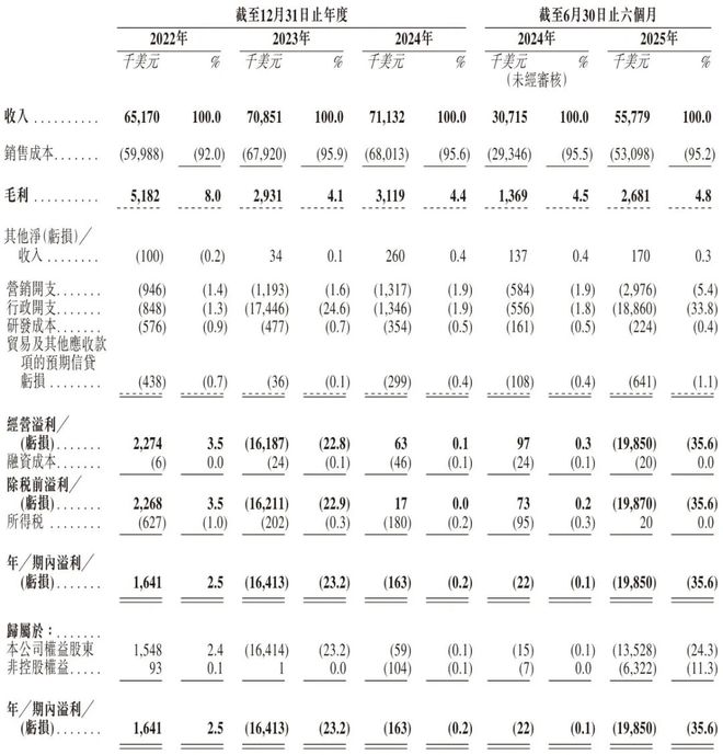 招股书显示,米多多2022年、2023年、2024年营收分别为6517万美元、7085万美元、7113万美元;毛利分别为518万美元、293万美元、312万美元;毛利率分别为8%、4.1%、4.4%;期内利润分别为164万美元、-1641万美元、-16.3万美元。