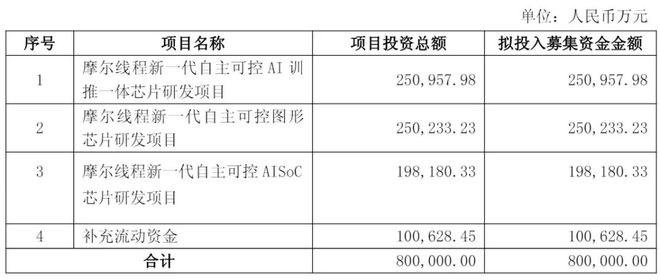 摩尔线程此次募资中25亿元用于新一代自主可控 AI 训推一体芯片研发项目,25亿元用于新一代自主可控图形芯片研发项目,19.8亿元用于新一代自主可控 AISoC芯片研发项目,10亿元用于补充流动资金。