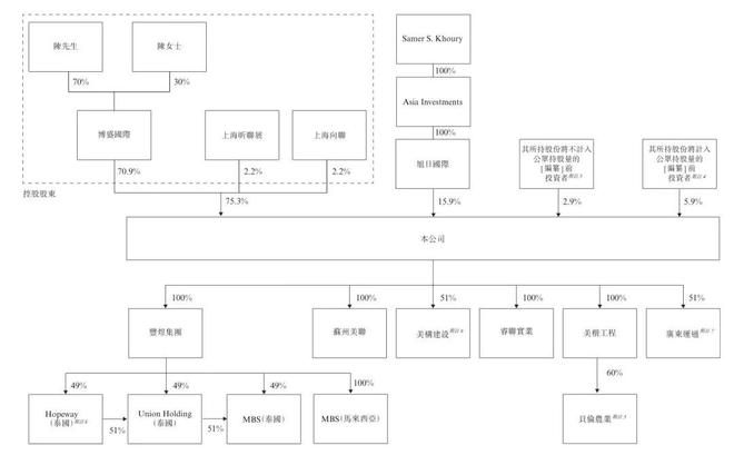 IPO前,美联股份由博盛国际持有约70.9%权益,而博盛国际则由公司执行董事陈先生和陈女士分别持有70%和30%权益。各员工持股平台(即上海向联和上海昕联展)均为有限合伙企业,截至最后实际可行日期分别持有本公司约2.2%和2.2%权益,并由作为执行事务合伙人的陈女士管理。